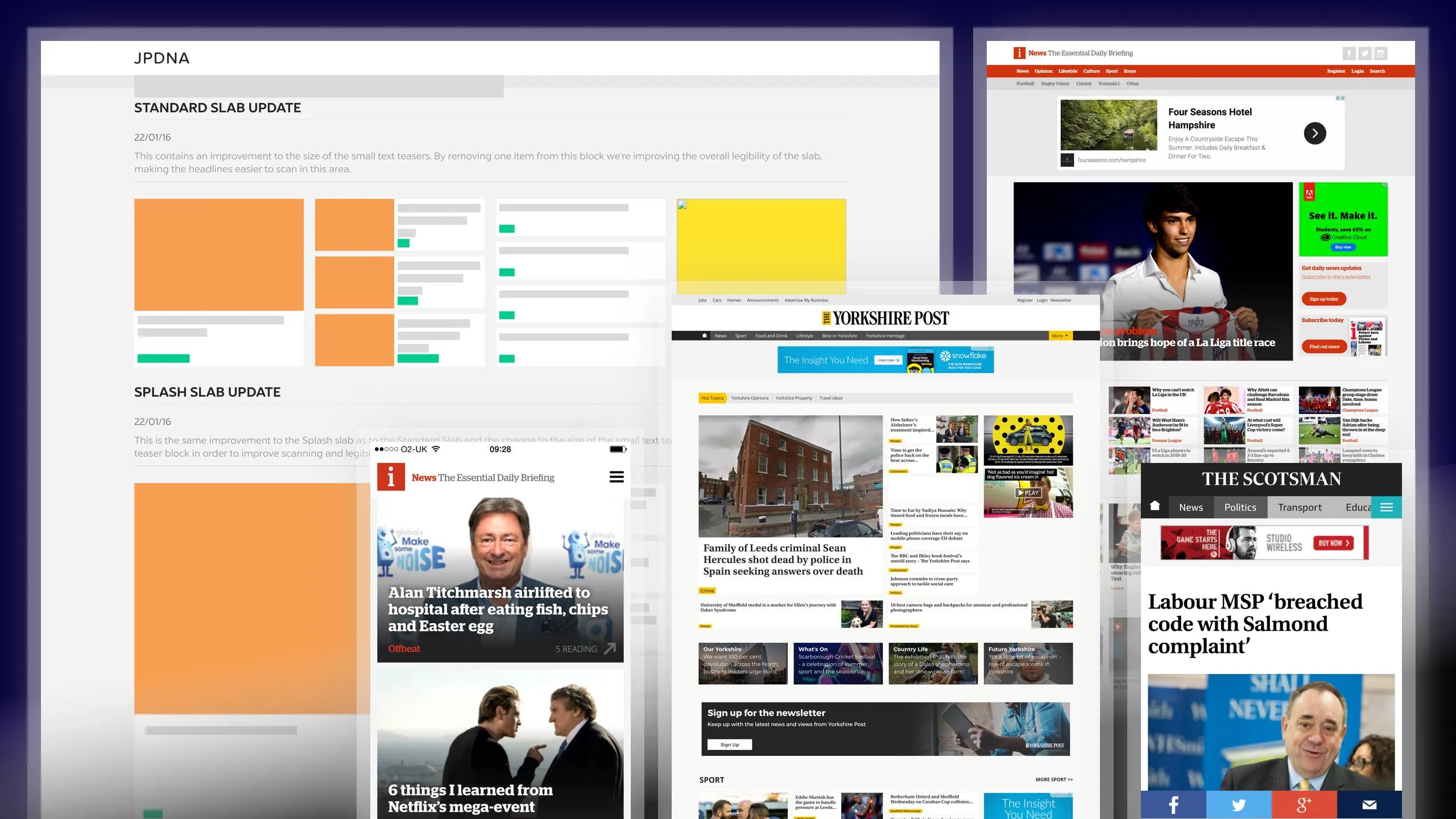 Before going further, I produced a short document titled 'JPDNA' outlining the concept, intentions, benefits and goals alongside a responsive HTML prototype of a Scotsman homepage and a selection of visuals of lower-level news titles.