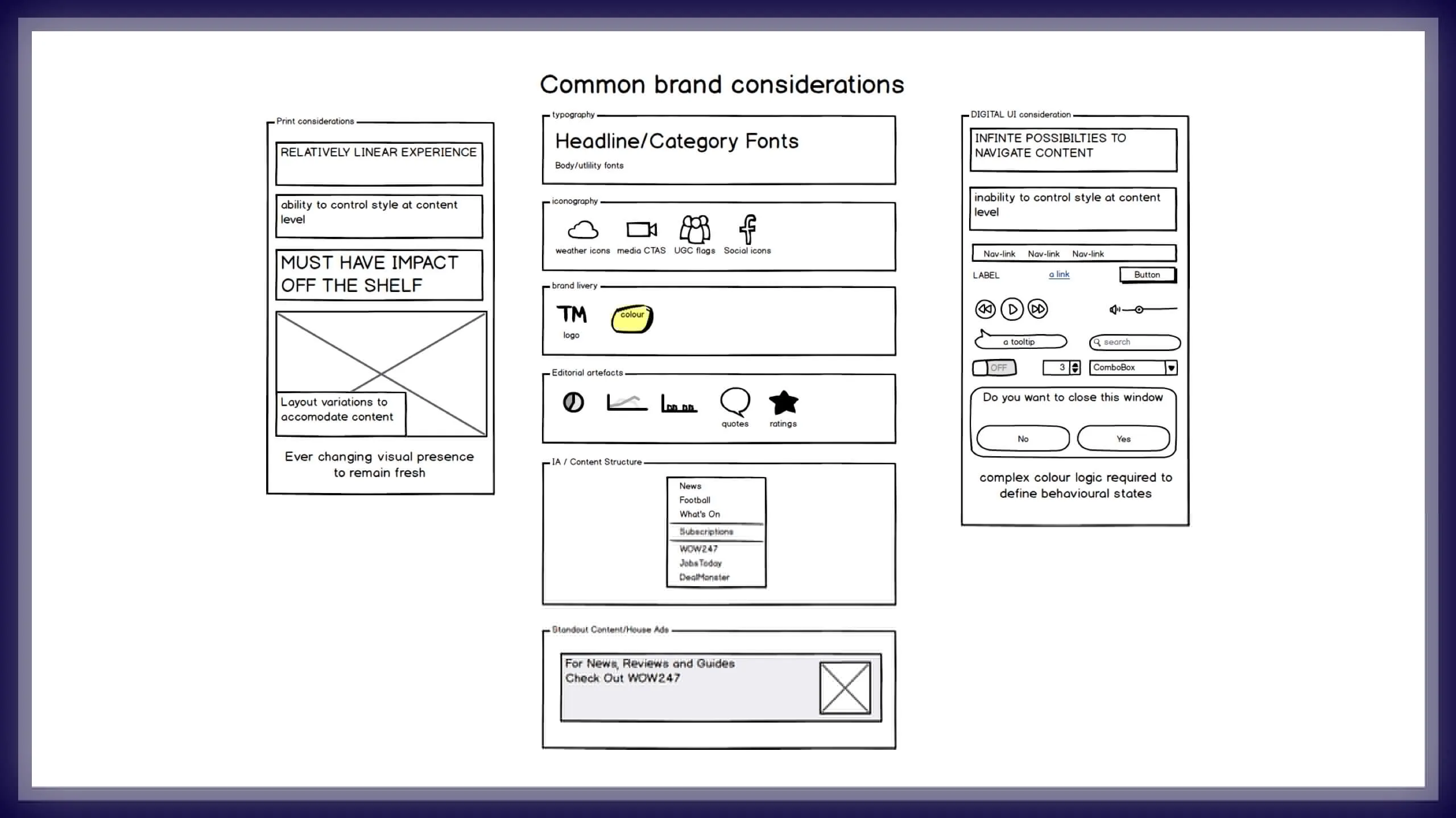 With this in mind, I found it helpful to outline the necessary divergences between the print and digital platforms elements, mapping out key platform considerations to help crystallise and educate stakeholders on where I felt the acceptable points of alignment would support one and other.
